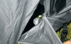 Der Eingang an der Vorderwand sowie der seitliche Eingang können hochgerollt werden oder als Sonnendach ausgestellt werden. Durch die zwei Eingänge mit Moskitogaze-Tür hält es Moskitos fern und sorgt zudem für eine stärkere Luftzirkulation. Die Klarfolienfenster sind an der Vorderwand von innen und an den Seitenwänden von außen blickdicht verschließbar, somit kannst du dich auch ganz ungestört in deinem Vorzelt aufhalten.